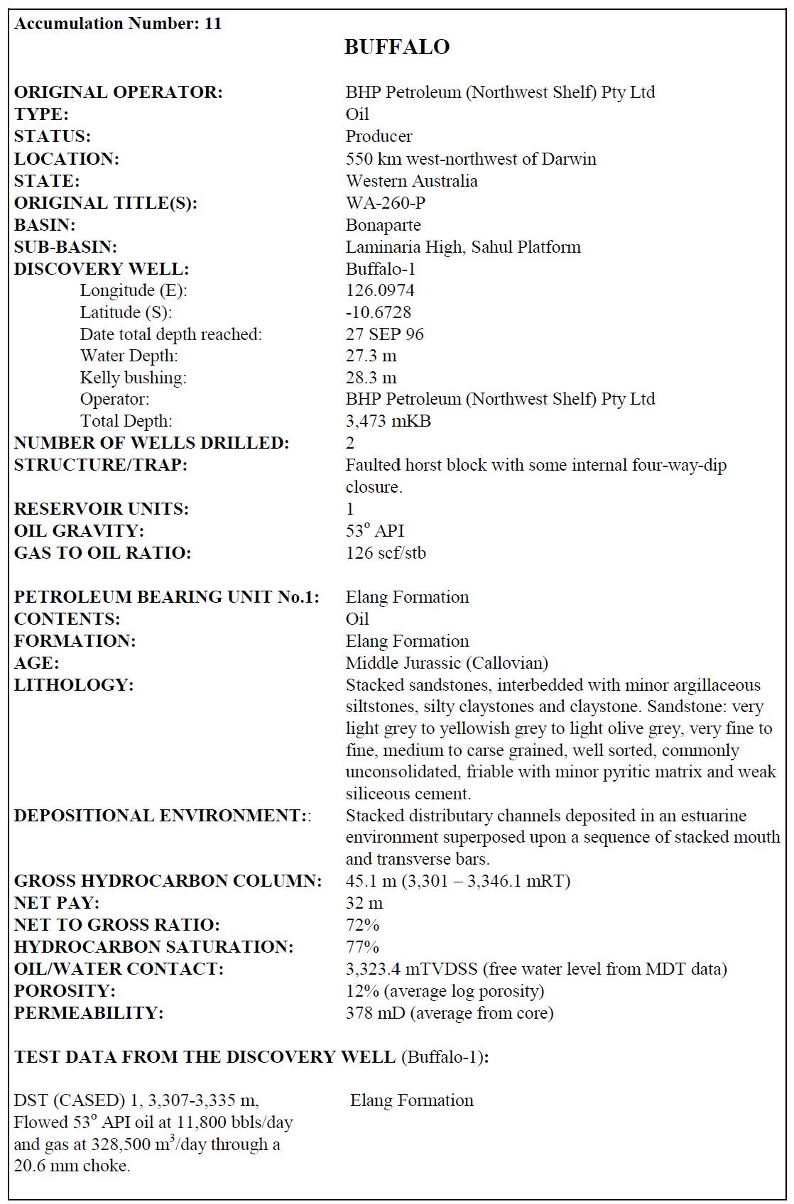 In 1996, Buffalo-1 was drilled 15 kilometres southeast of the Laminaria oil field, on the flank of the Laminaria High, in the Northern Bonaparte Basin. The well flowed oil and gas on DST from the Elang / Laminaria Formation. An appraisal well (Buffalo-2) was drilled in 1997 and cased and suspended as a future oil producer.
