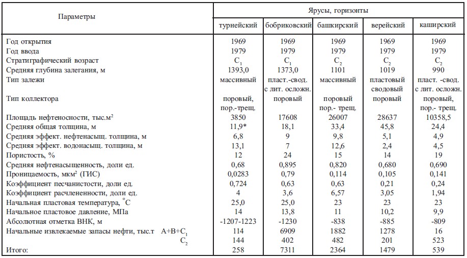 Промышленно нефтеносными на месторождении являются карбонатные отложения каширского, верейского, башкирского возрастов среднего карбона, бобриковского, турнейского возрастов нижнего карбона.