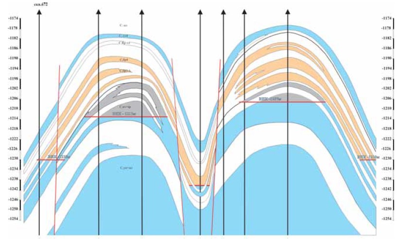 Рис.1. Бурейкинское месторождение. Схематический геологический профиль продуктивных отложений нижнего карбона