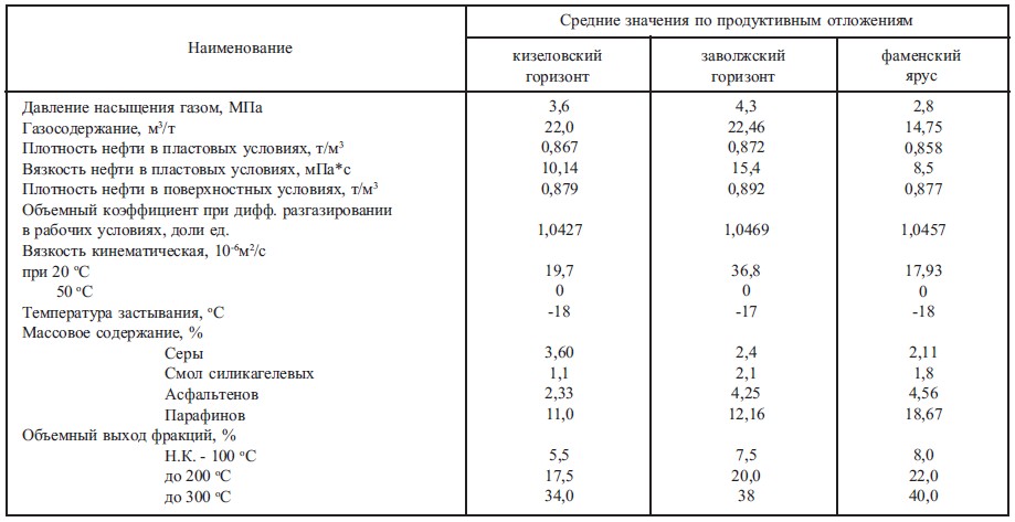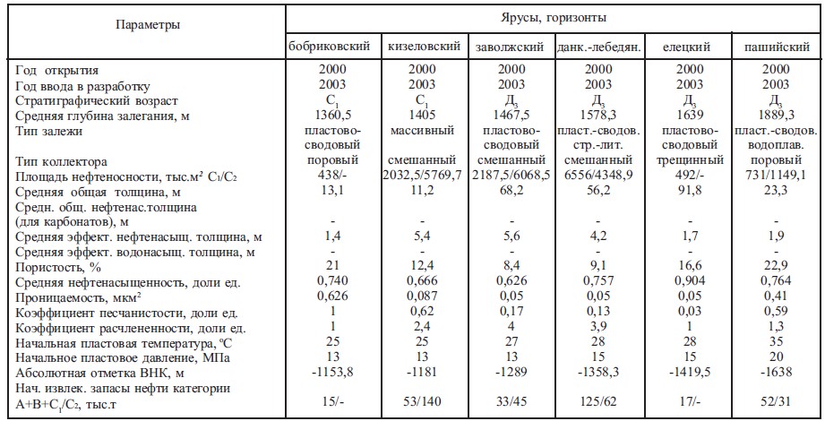 Коллекторы отложений пашийского и бобриковского горизонтов сложены песчано-алевролитовыми породами (поровый тип), кизеловского горизонта турнейского яруса, заволжского, данково-лебедянского, елецкого возрастов – преимущественно известняками нескольких структурно-генетических разностей с прослоями доломитов, характеризующихся микро- и макротрещиноватостью хаотичного и субвертикального направления, которая является основной флюидопроводящей системой (преимущественно трещинно-поровый тип, табл.1). Нефти месторождения не исследовались и при подсчете запасов их свойства приняты по аналогии с близлежащим разрабатываемым Урустамакским месторождением (табл. 2). Запасы нефти утверждены в ГКЗ РФ (табл. 1).