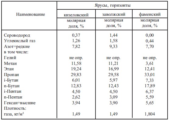 Табл.3. Характеристика попутных газов продуктивных отложений Бухараевского месторождения (однократное разгазирование; мольное содержание, %)