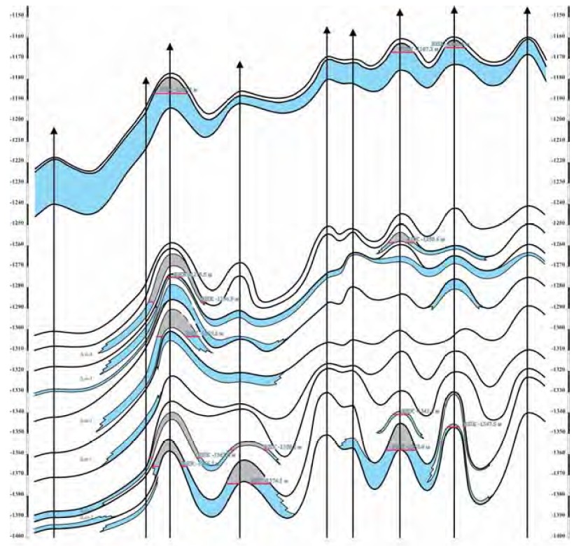 Рис.2.Бухараевское месторождение. Схематический геологический профиль продуктивных отложений нижнего карбона и верхнего девона