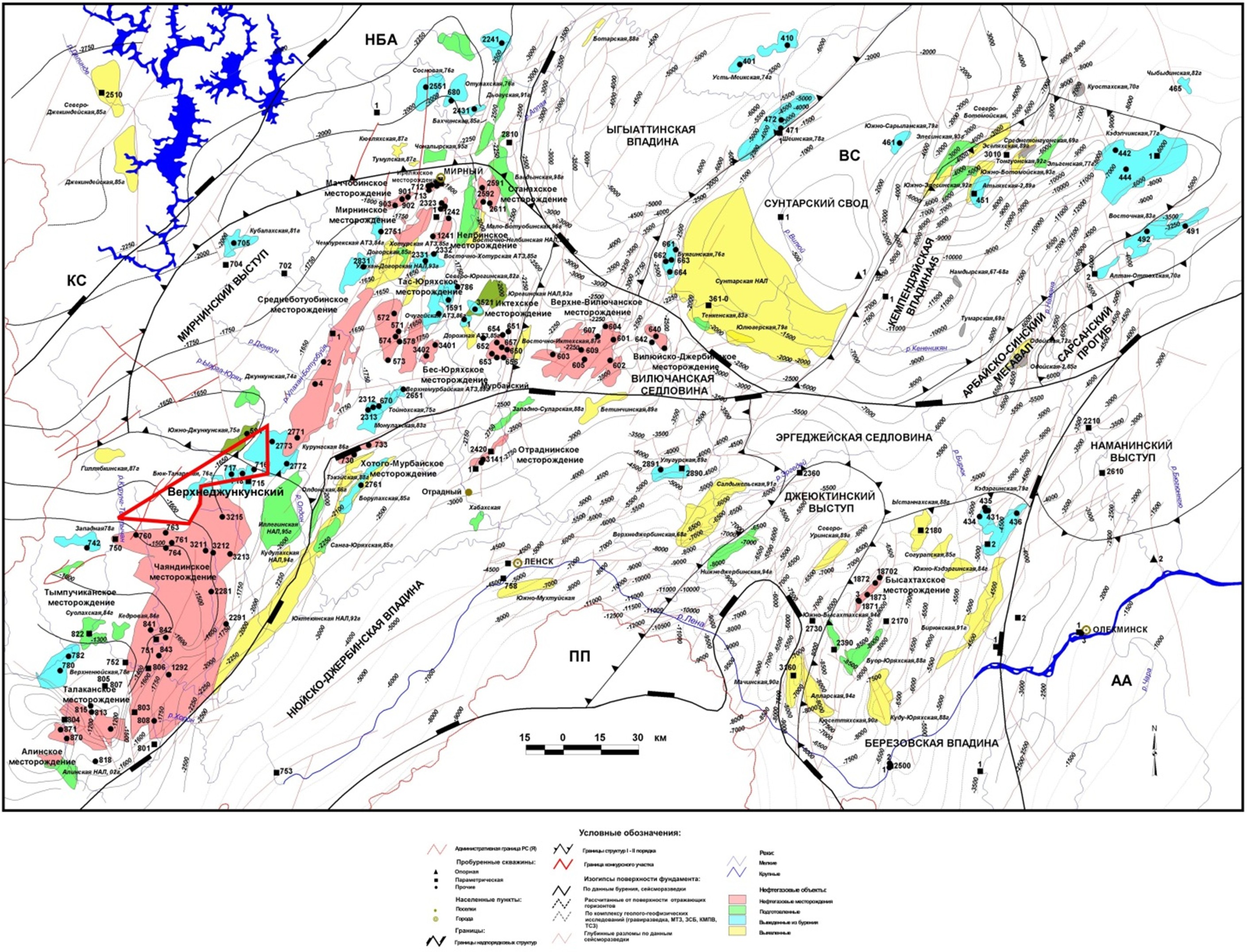 Рис.1. Структурная карта по кровле фундамента