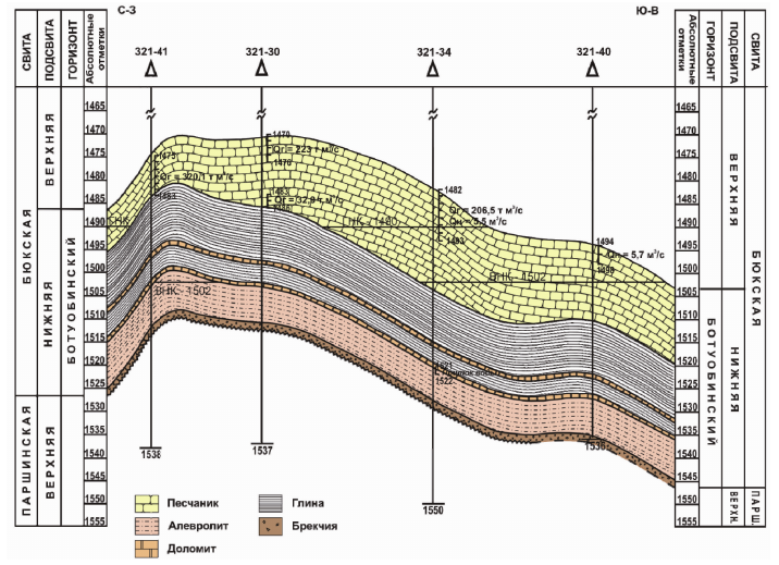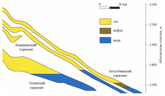 Залежи ботоубинского продуктивного горизонта представляют собой мелко-среднезернистые, массивные песчаники, отлично отсортированные по площади залегания. Нижняя часть геологического разреза ботоубинского продуктивного горизонта характеризуется наличием переслаивающихся аргиллитов, песчаников и алевролитов. Выявлены замещения песчаников верхней части. Всего выделяется 12 залежей. Хамакинский горизонт, в свою очередь, сложен в основном песчаниками мелко, средне-крупнозернистыми и имеет глубину залегания отложений 1490- 1858 м. Границей раздела хамакинского горизонта от ботоубинского является пачка глинисто-алевролитовых непроницаемых пород толщиной 20–45 м. Общее количество залежей составляет 16, при этом имеются тектонические и литологические осложнения в разной степени. 15 Талахский горизонт исследуемого месторождения представлен песчаниками мелко-крупнозернистыми, часто разнозернистыми с глубиной залегания залежей от 1249,2 м до 1448 м. Количество залежей составляет 13, по своему строению представляют собой пластовые ловушки, тектонически экранированные. (Будовская М. Е. 2022)