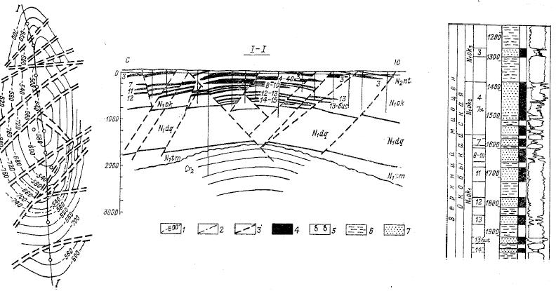 1-изогипсы по кровле пласта 13-бис, 2- контур нефтеносности, 3- разрывы, 4- нефть, 5- газ, 6- глинистые, 7- песчаные породы