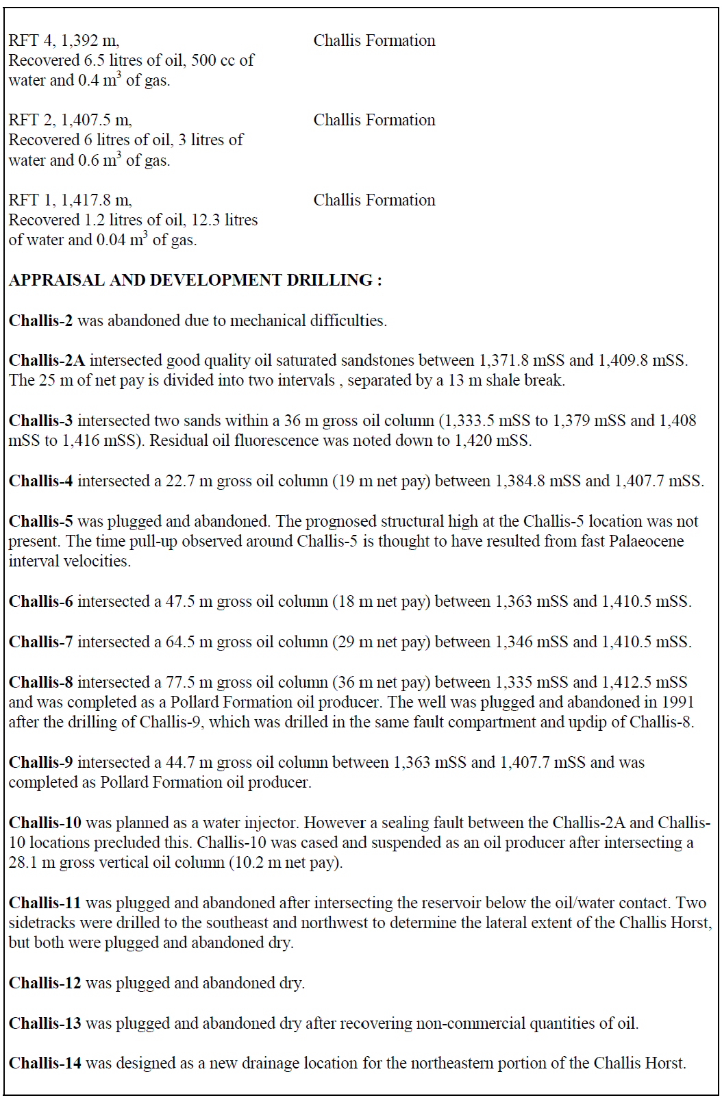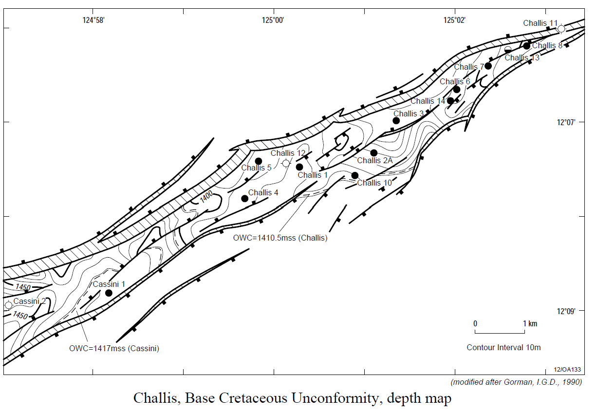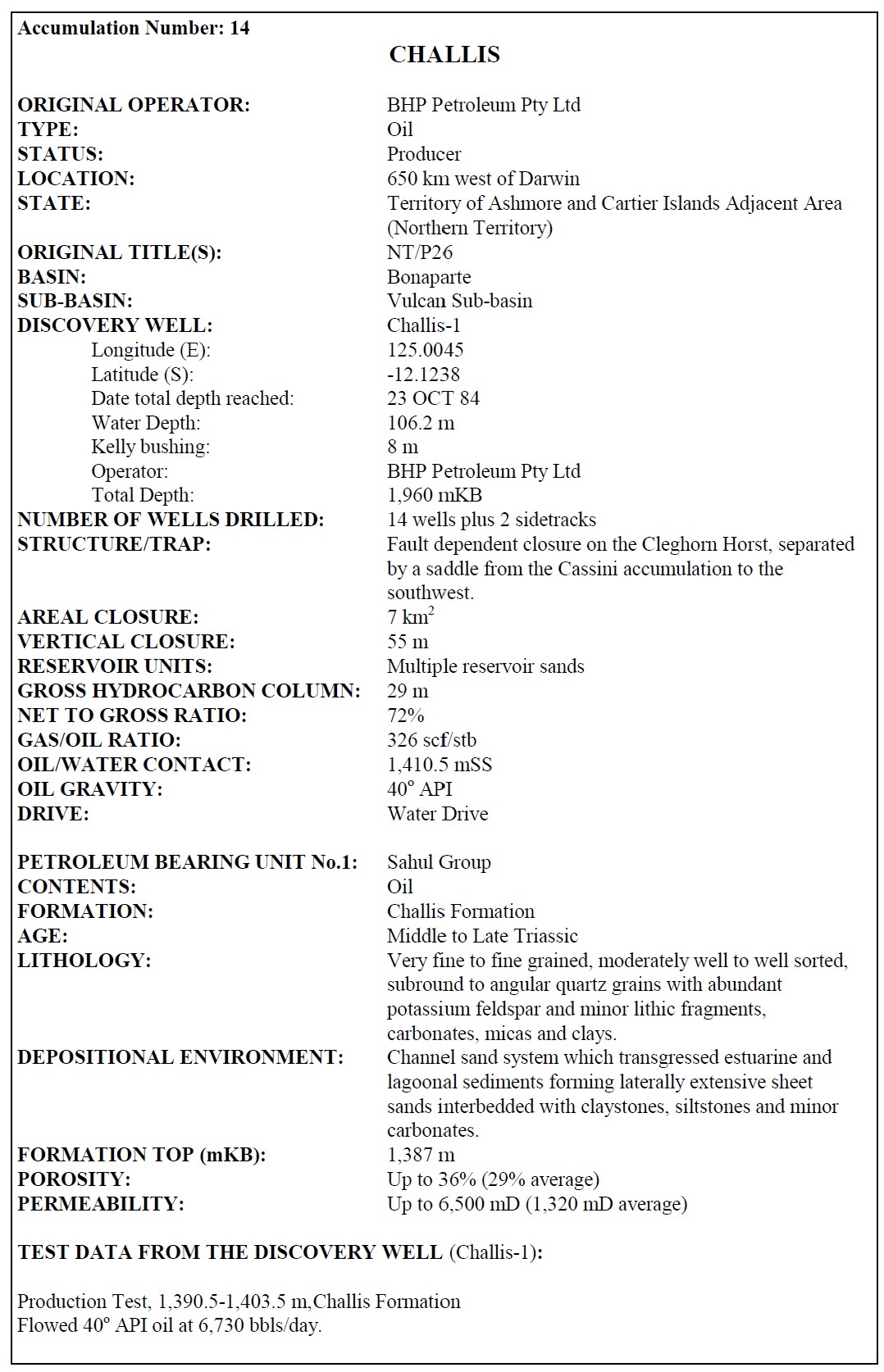 The Challis oil field was discovered in 1984 when Challis-1, drilled on a Triassic horst block on the Jabiru Terrace (Vulcan Sub-basin), intersected a 29 metre gross oil column within the Challis Formation. The Triassic, reservoir sands at Challis sub-crop the Valanginian unconformity and are sealed by basal claystones, marls and carbonates of the Bathurst Island Group (Wormald, 1988; Gorman, 1990).