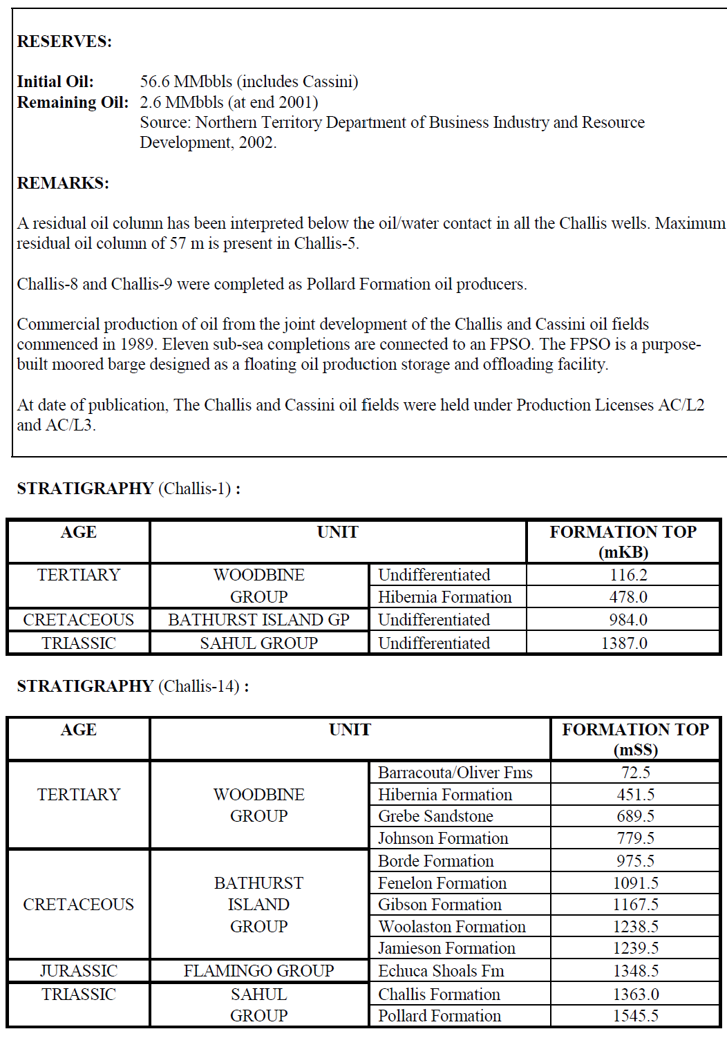 Initial oil reserves at Challis / Cassini have been estimated at 56.6 million barrels and, at end 2001, remaining reserves at 2.6 million barrels. (Northern Territory Departmentof Business, Industry and Resource Development, 2003).