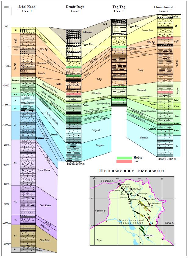 Рисунок 1 Схема корреляции разрезов скважин Месопотамского краевого прогиба по линии I-I`