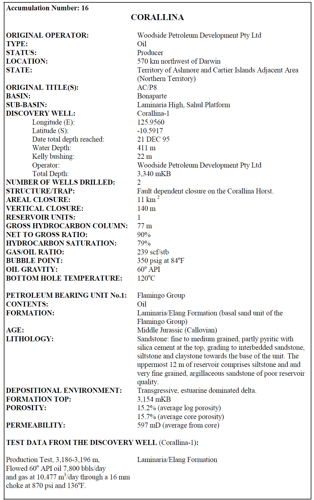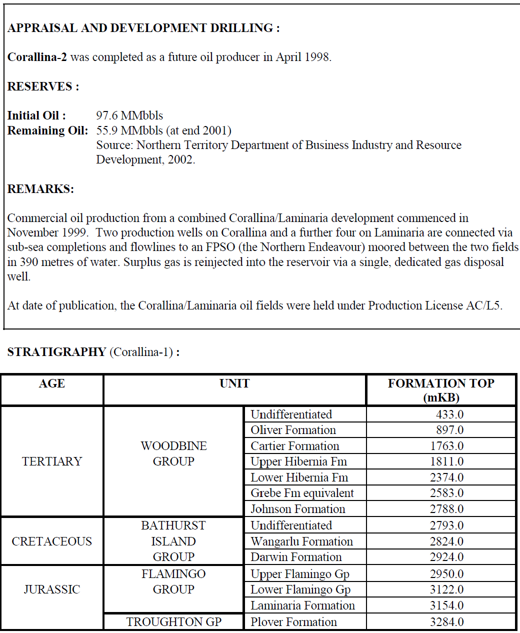 In December 1995, Corallina-1 was drilled on a complex fault block, 10 kilometres northwest of Laminaria-1. The well flowed oil on test from the Elang / Laminaria Formation. Water depths increase from 300-400 metres over Laminaria, to 400-450 metres over Corallina.