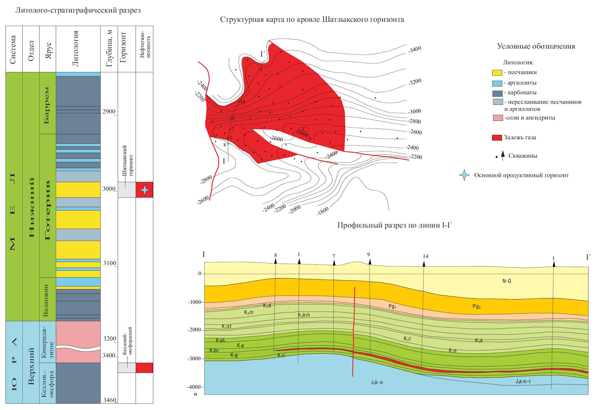 Притоки газа были получены из нескольких пластов песчаников некома и подсолевых карбонатов верхней юры (келловей-оксфорд), основные запасы газа содержатся в надсолевом шатлыкском горизонте (готерив). Шатлыкский горизонт сложен высокопористыми красновато-коричневыми песчаниками, расчлененными пластами, пропластками и линзами плотных песчаников, алевролитов и глин.