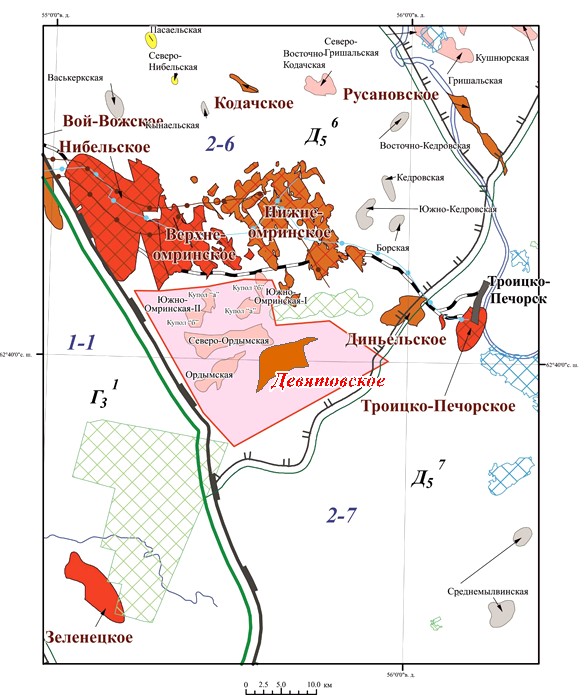 В пределах исследуемого района нефтегазоносность установлена в широком стратиграфическоском диапазоне – от силура до нижнего карбона включительно. Здесь открыты Нижнеомринское газонефтяное, Верхнеомринское, Нибельское, Троицко-Печорское нефтегазовые, Кодачское, Динъельское, Девятовское нефтяные месторождения, находящиеся на различных стадиях освоения.