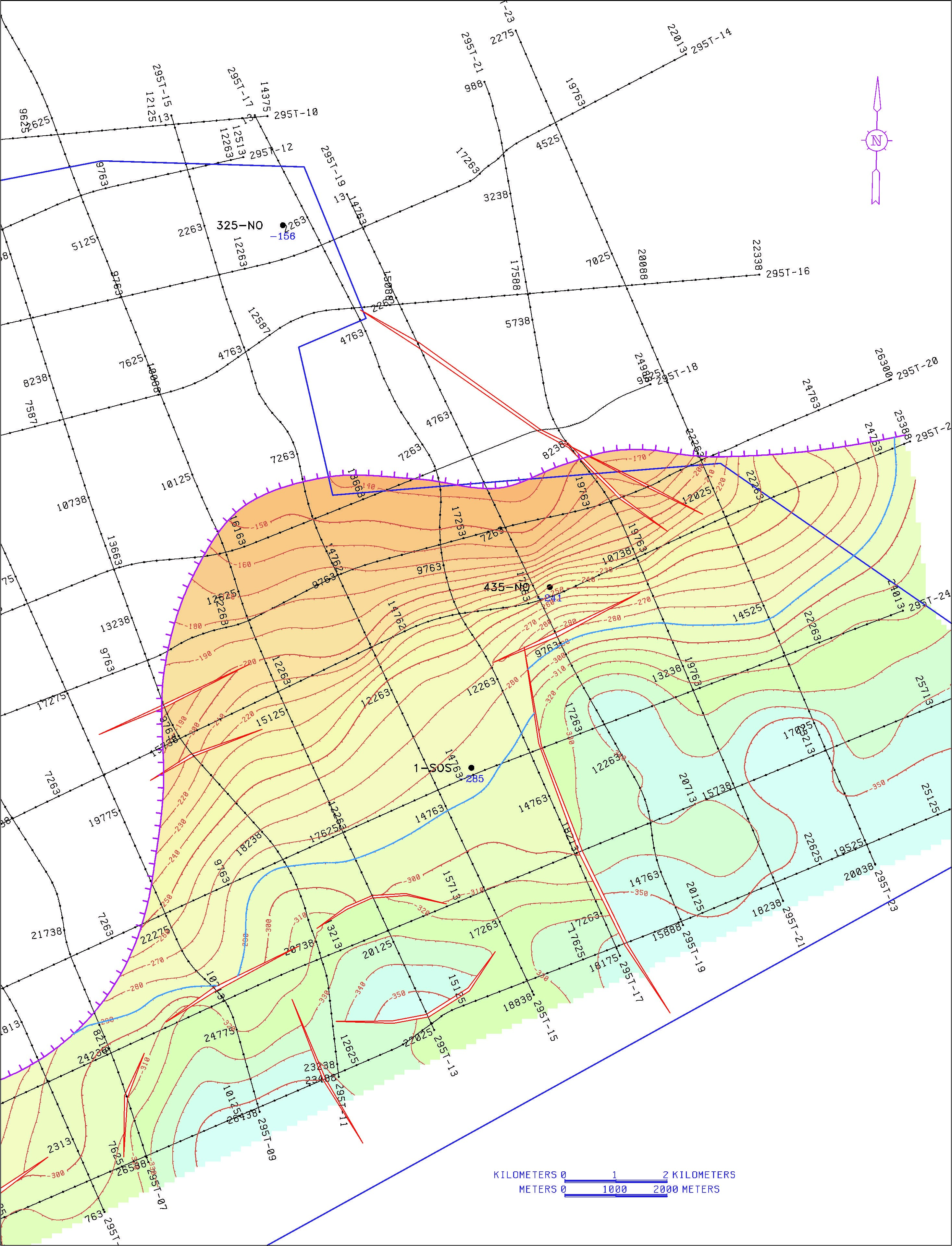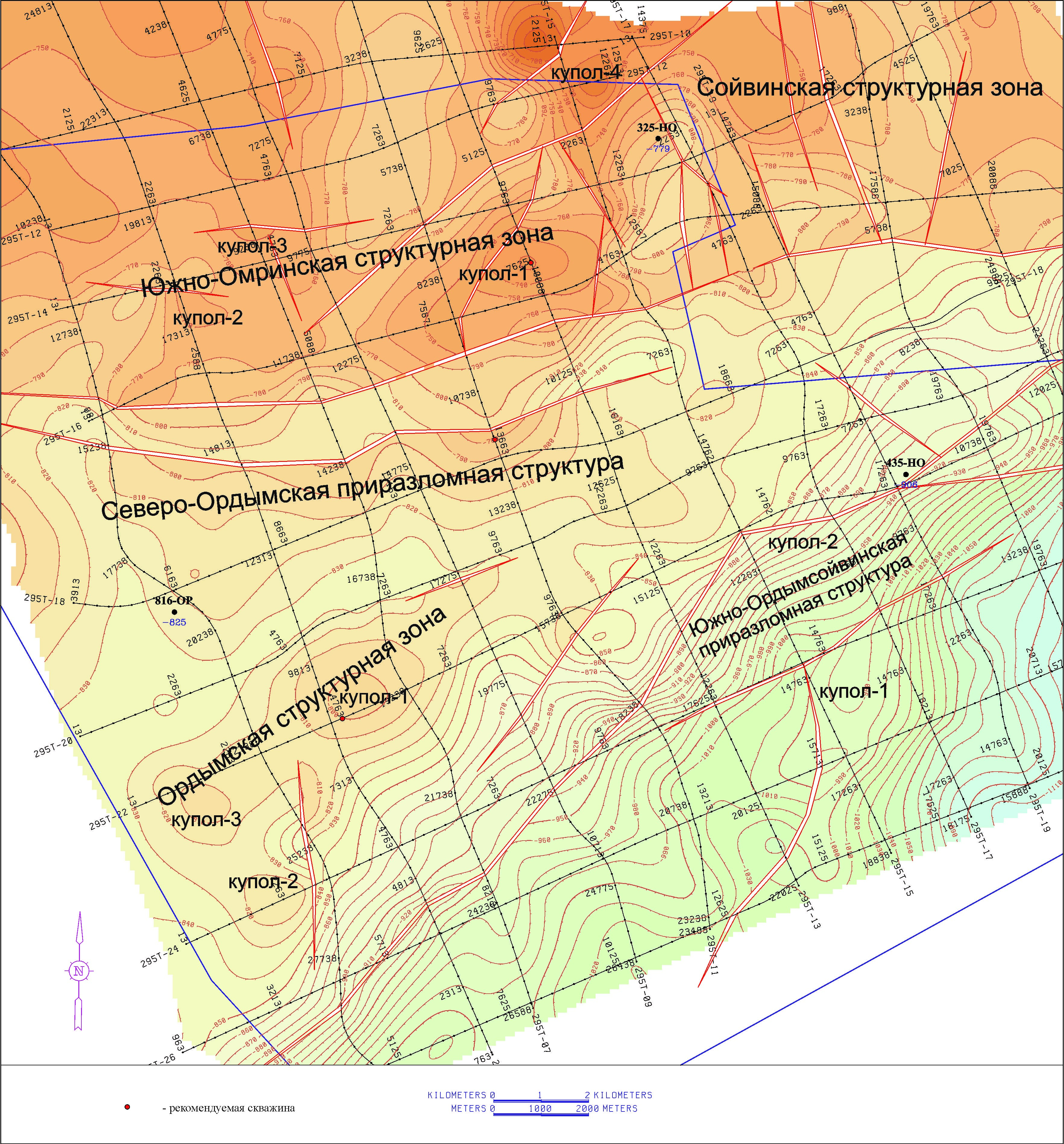 Южнее Северо-Ордымской приразломной структуры подтвержденаОрдымская структура, размеры которой по ОГ IIIdzr (Рис. 4) в контуре изогипсы минус 820 м составляют 8,7×2,5 км, амплитуда 20 м. Структура представлена антиклинальной складкой северо-восточного простирания с пологим северным и крутым, переходящим в флексуровидный изгиб слоев, южным крылом и имеет трехкупольное строение. Свод структуры находится в пределах северо-восточного купола, подсеченного профилем 295-05. Структура сформировалась в зоне развития фаменского барьерного рифа.