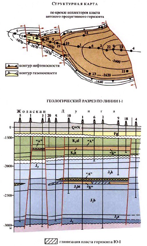 Глубина залегания юрских залежей составляет около 2250 м. Горизонт Ю-IA нефтегазовый. Его эффективная газонасыщенная толщина не превышает 2,9 м. Горизонт Ю-IБ чисто нефтяной. Эффективные нефтенасыщенные толщины юрских залежей составляют 1,5-2,0 м. Начальные пластовые давления в них равнялись 23,8 МПа, температура 80-82°С.