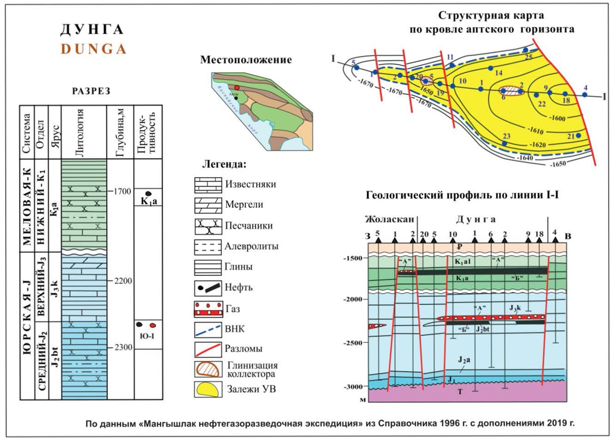 Нефтяное месторождение Дунга находится в Мангыстауской НГО и расположено в приморской зоне, на Беке-Башкудуском валу. В структурном отношении месторождение приурочено к тектонически ограниченным ловушкам, выявленным на западном периклинальном погружении мезозоиского вала, которые замыкаются в общем плане по реперу в аптских отложениях изогипсой минус 1670 м. Здесь закартированы четыре ловушки, последовательно погружающиеся в западном направлении. На двух восточных ловушках разведаны залежи нефти и газа Дунгинского месторождения, на западных - Жоласкана.
