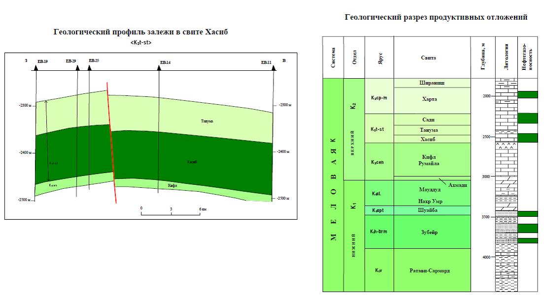 Продуктивны верхнемеловые известняки свит Хасиб, Сади, Харта на глубине 1830- 1950 м и нижнемеловые песчаники свиты Зубейр в интервале 2000-2135 м. Основная добыча нефти производится из песчаников Зубейр. Коллекторы гранулярного типа с пористостью 18-20% и проницаемостью до 600 мД. Дебиты нефти из песчаников Зубейр достигают 1450 м/сут. Залежи пластовые сводовые. В верхнем мелу залежи массивные сводовые.
