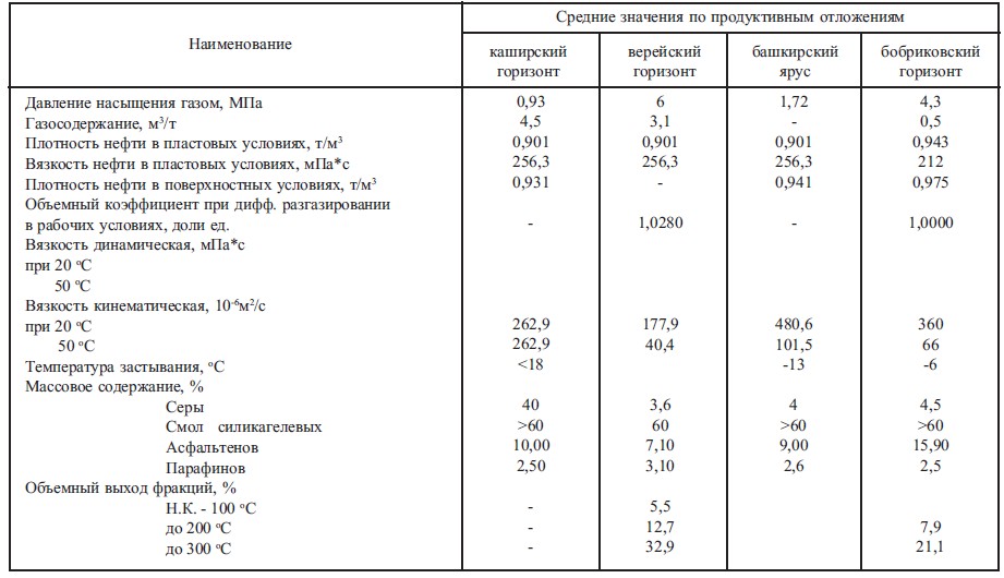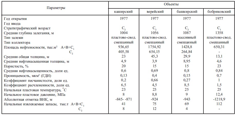 Залежи нефти башкирского и верейского объектов имеют наибольшие нефтенасыщенные площади и перекрывают в плане все остальные (рис.36.1, табл. 1). Режим залежей упруго-водонапорный. Пласты-коллекторы бобриковского возраста имеют повсеместное распространение. Особенностью строения залежей нефти являются относительно небольшие размеры и обширные водонефтяные зоны. Режим залежей упруго-водонапорный. Источником пластовой энергии в них являются напор краевых вод, упругость жидкости и породы. Нефти месторождения относятся к тяжелым, вязким, высокосернистым, парафинистым. 65% НИЗ месторождения сосредоточено в карбонатных коллекторах.