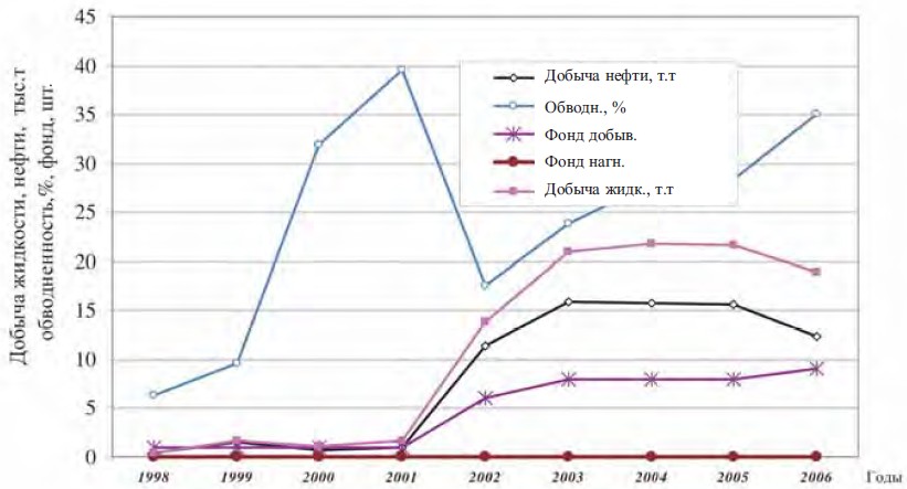 Первая технологическая схема разработки месторождения была составлена в 1999 г. НПП «Нефтегеотехнология». В ней предусматривалось выделение четырех объектов эксплуатации, размещение проектного фонда по равномерной треугольной сетке, поддержание пластового давления путем внутриконтурного заводнения, разработка отложений среднего карбона скважинами, возвращенными с других объектов. В 2006 г. отбор нефти составил 12,3 тыс.т. Среднегодовая обводненность – 28,7%. Суммарный отбор жидкости на 01.01.2006 г. составил 82,966 тыс.т, в том числе нефти – 62,163 тыс.т и воды – 20,803 тыс.т (рис. 1). Текущий коэффициент нефтеизвлечения достиг значения 20,9%, водонефтяной фактор составил 0,33 д.ед. при средней обводненности 28,3%.
