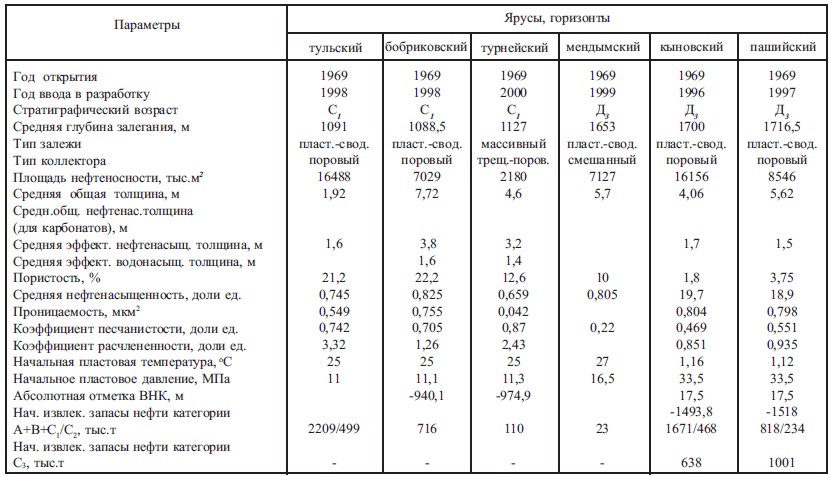 Основные промышленные залежи нефти приурочены к терригенным пластам – коллекторам верхнего девона (пашийский и кыновский горизонты) и нижнего карбона (бобриковский и тульский горизонты). Небольшие залежи нефти фиксируются в карбонатных породах верхней части турнейского яруса нижнего карбона и средней части мендымского горизонта верхнего девона. Все продуктивные отложения в разрезе месторождения отличаются неоднородностью по площади и разрезу (табл. 1). Залежи по своему строению относятся к пластово-сводовым и массивным (рис. 1, табл. 1).