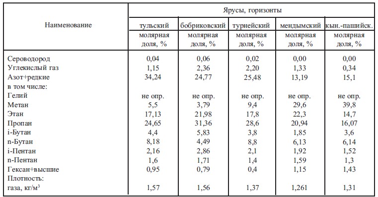Табл.3. Характеристика попутных газов продуктивных отложений Елгинского месторождения (однократное разгазирование; мольное содержание, %)