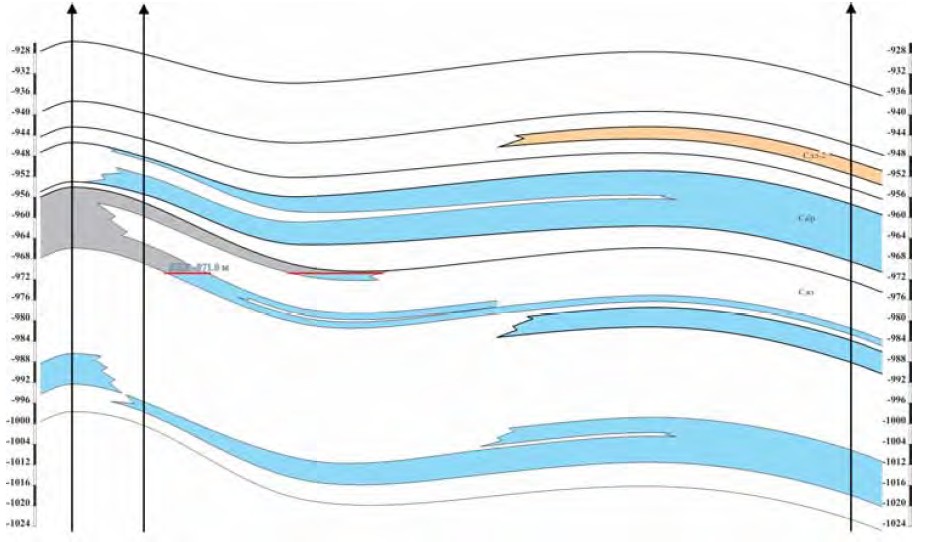 Рис.1.Елгинское месторождение. Схематический геологический профиль продуктивных отложений нижнего карбона