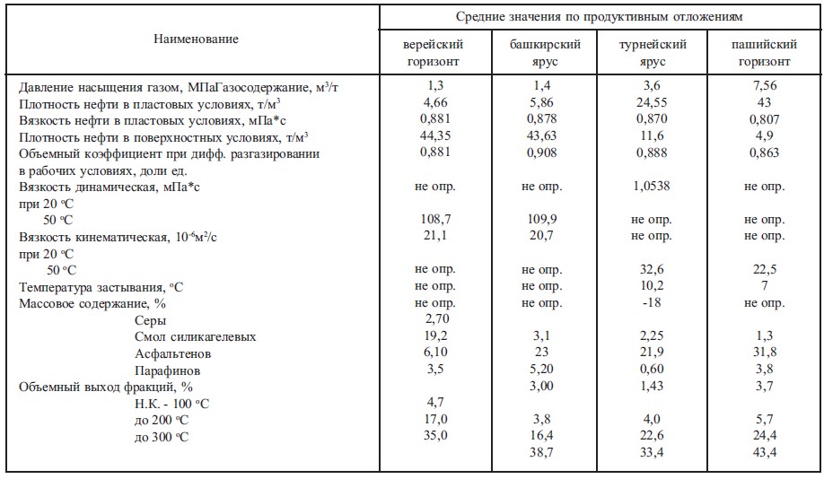 Нефти месторождения по результатам исследований пластовых и поверхностных проб можно отнести к тяжелым, сернистым, парафинистым, маловязким – в отложениях девона и высоковязким – в отложениях карбона (табл.2). Характеристика попутного газа, добываемого с нефтью, приведена в таблице 3. Запасы нефти утверждены в ЦКЗ РФ (табл.1).