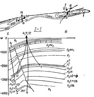 Рис.1. Структурная карта Голицынского газоконденсатного месторождения по кровле палеоценовых отложений и геологический разрез по линии I-I (по А. Я. Дергачевой и В. В. Гайдук, 1982 г.).