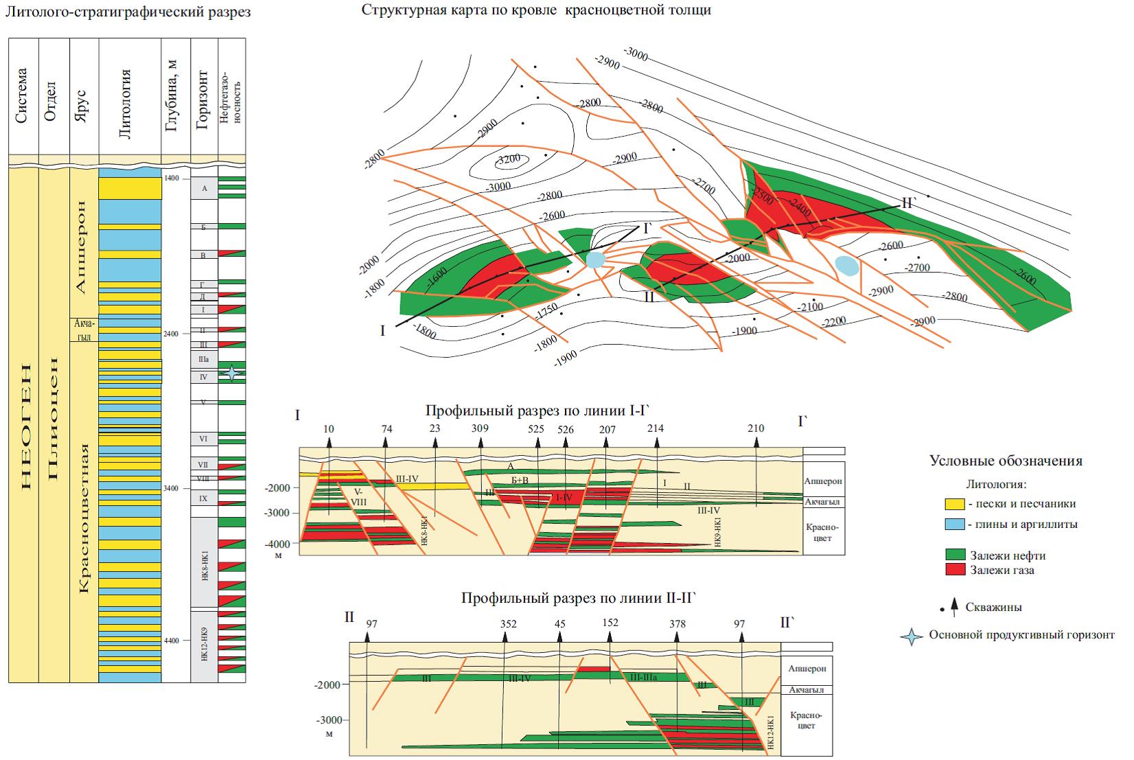 Нефтеносность месторождения связана с отложениями апшеронского яруса (горизонты А, Б, В, Г, Д и I), акчагыльского яруса (II), красноцветной толщи (горизонты III, IIIa, IV, V, VI, VII, пачки VIII и IX верхнего отдела красноцветной толщи). В нижней части красноцветной толщи выявлены нефтяные залежи НК8 – НК1 и НК12 – НК9.