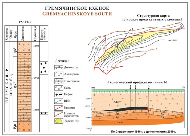 Нефтяное месторождение Гремячинское Южное расположено в западной части Северо-Прикаспийской НГО, к югу от нижнепермского карбонатного уступа. Установлена нефтеносность казанских отложений, в нижней части которых выявлена внутрисолевая антиклинальная складка, нарушенная разломами.