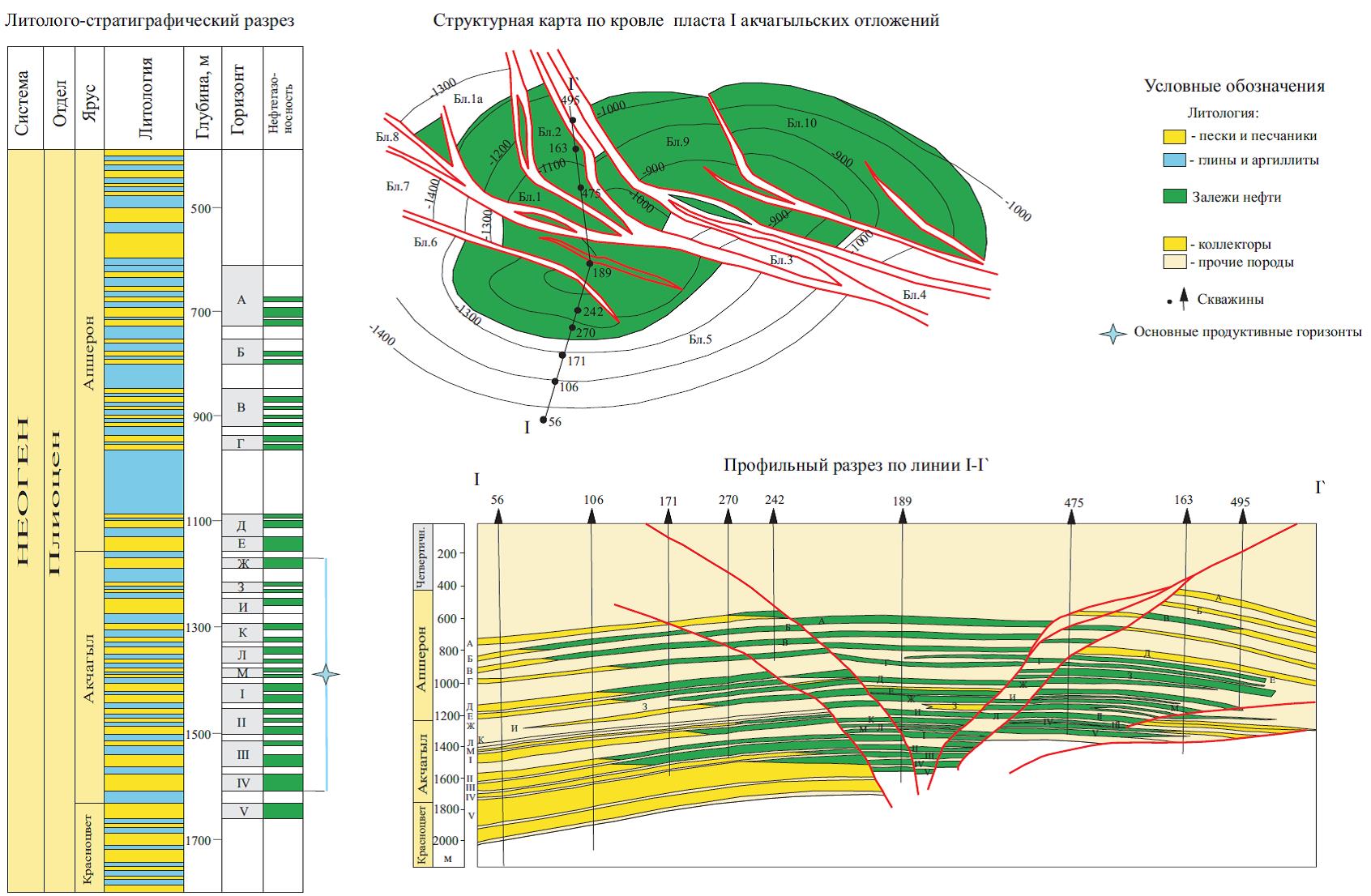Горизонты Ж, 3, И, К объединены в один эксплуатационный объект Ж, который представлен песчано-глинистыми отложениями с преобладанием глин общей мощностью 150-170 м. Средняя проницаемость горизонтов – 0,05 мкм2, пористость -24%. Залежи пластовые, тектонически экранированные.
