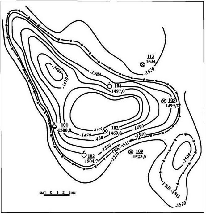 Рис.1. Гыданское месторождение. Структурная карта по кровле пласта ТП1/3 (изогипсы по отражающему горизонту М) (по данным ГГП «Ямалнефтегазгеология» 1993 г.)
