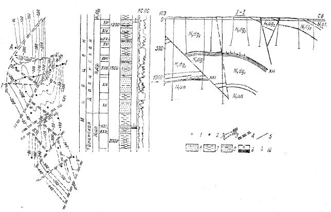 Скважины: 1- разведочные, 2- структурные; 3- изогипсы: а- по кровле Х пласта, б- по кровле пласта IIIа (мощного пропласта средней III пласта); 4- разрывы, 5- поверхность несогласного залегания, 6,7,8- песчаные, глинистые, песчано-глинистые породы, 9- нефть и газ, 10- газ