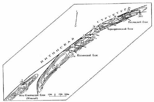 Интинская структура приурочена к Интинской складчато-чешуйчатой зоне в Косью-Роговской впадине. Складка представляет собой сложно- построенную узкую (около 2 км) протяженную (40км) антиклиналь, ограниченную с северо-запада надвигом и разделенную тектоническими нарушениями различного характера на четыре основных блока: Усть- Кожимский (Южный), Косьинский, Чернореченский и Интинский.