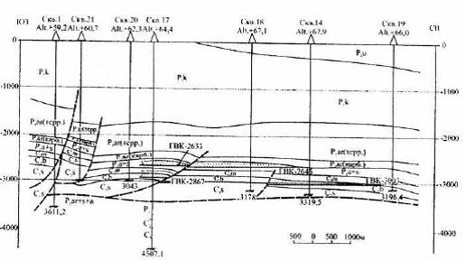 Рис. 2. Интинское газовое месторождение. Геологический разрез продуктивных пермско-каменноугольных отложений по линии скважин 1-20-17-1814-19 (Щербаклв и др. 1987 г.)
