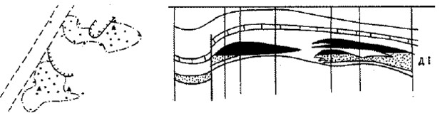Рис.1.Карта контуров залежей ДI. Геологический профиль