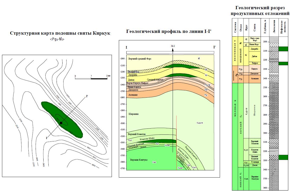 В олигоцен-нижнемиоценовом резервуаре выявлено два продуктивных горизонта. Верхний приурочен к мергелистым сильно трещиноватым известнякам свиты Джерибе (нижний миоцен) на глубине 2050-2120 м. Плотность нефти - 0,883 г/см3.