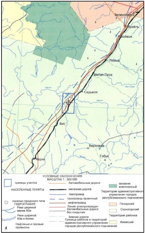 Кабантывисовское месторождение нефти находится на территории Сосногорского района Республики Коми (рис. 1). Ближайшим населенным пунктом является пос. Вис, расположенный в 10 км к юго-западу на железной дороге Москва-Воркута, проходящей вдоль северо-западной оконечности месторождения (через центр Кабантывисовского лицензионного участка). Районный центр г. Сосногорск находится в 58 км к юго-западу.