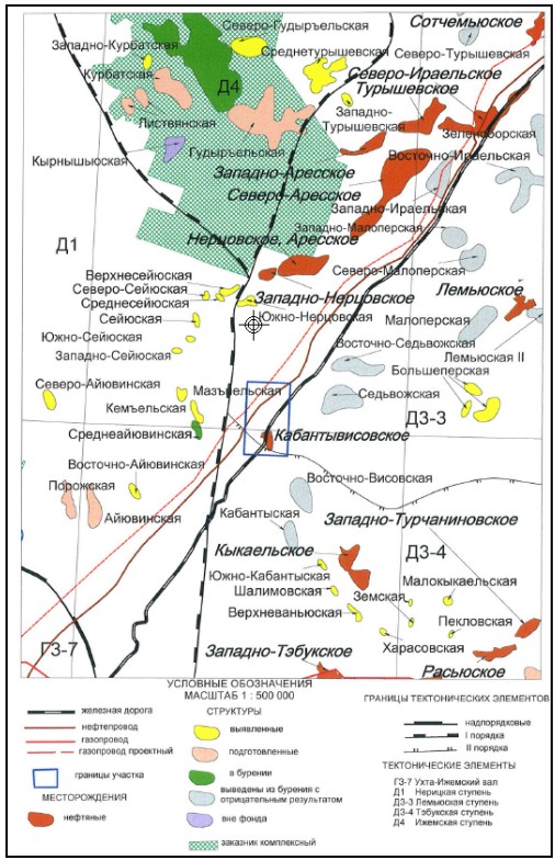 По тектоническому районированию ТПП Кабантывисовский лицензионный участок находится на территории Лемьюской и Тэбукской ступеней - тектонических элементов II порядка в составе Омра-Лыжской седловины, структуры I порядка, которая, в свою очередь, относится к Ижма-Печорской синеклизе. Участок расположен в зоне сочленения Лемьюской и Тэбукской ступеней (рис. 2.). Лемьюская ступень залегает гипсометрически выше расположенных с севера, запада и востока Лузской, Ижемской, Ронаельской ступеней и ниже Тэбукской ступени, расположенной южнее.