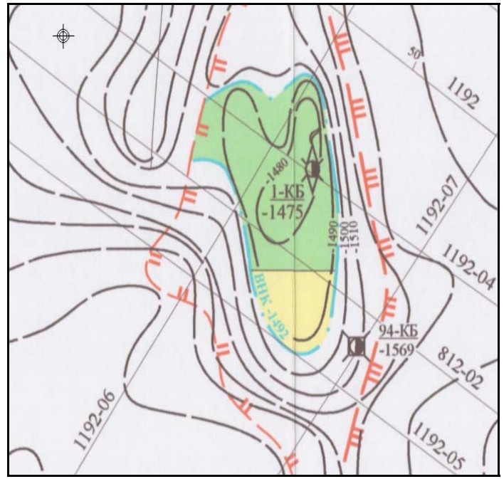 ВНК принят на абсолютной отметке -1492 м по нижним дырам интервала перфорации, откуда был получен приток чистой нефти. Покрышкой служат карбонатноглинистые породы задонского горизонта. Высота залежи 17 м.