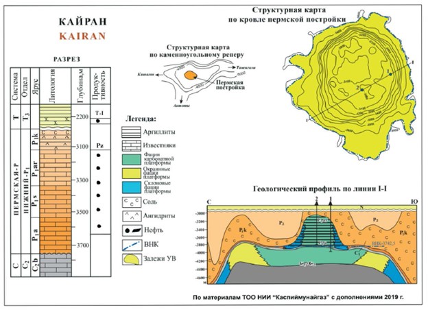 Нефтяное месторождение Кайран находится в северной части акватории Каспия и входит в кашаrанскую группу месторождений. Располагается на одном из крупных выступов на теле единого с Кашаганом внутрибассейнового карбонатного массива, сформированного на девонском цоколе.
