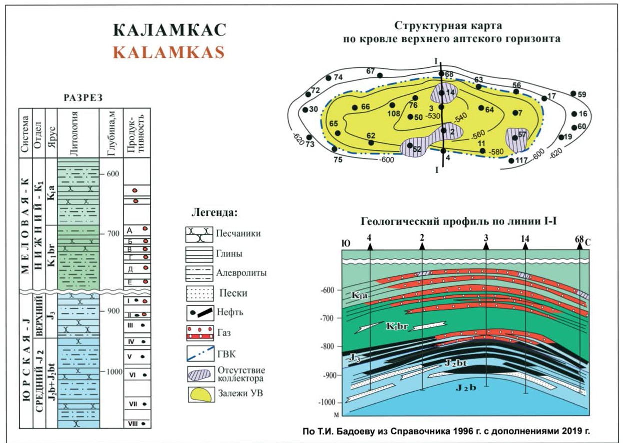 Газонефтяное месторождение Каламкас открыто в 1976 г. Приурочено к слабо нарушенной брахиантиклинальной складке широтного простирания, в пределах которой доказана газоносность 6 пластов в неокоме, двух – в апте и 7 газонефтяных и нефтяных горизонтов в верхней и средней юре. Продуктивность разреза доказана в интервале 550-900 м. В процессе эксплуатационного разбуривания дополнительно выявлено 5 стратиграфических залежей, связанных преимущественно с верхнеюрской толщей. Все остальные залежи пластовые, сводовые, слабо нарушенные с элементами литологического и тектонического экранирования. Основной покрышкой над юрскими залежами является 50-ти метровая пачка глин, залегающая в основании неокома.