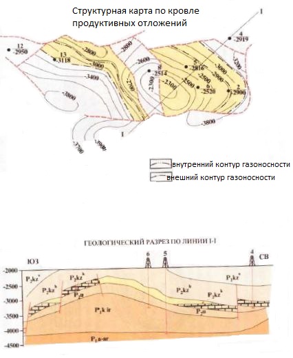 Установлена залежь с содержанием конденсата до 40 г/м3. Залежь по типу пластовая, сводовая и тектонически экранированная с доказанной высотой 530 м. Продуктивные известняки и доломиты перекрыты верхнепермской (казанской) солью.