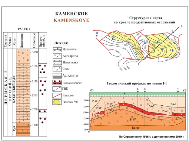 Газоконденсатное месторождение Каменское расположено на западе Северо-Прикаспийской НГО к югу от нижнепермского карбонатного уступа и контролируется внутрисолевой ловушкой. Залежь газоконденсата выявлена в межсолевой толще (156-180 м) карбонатных пород калиновской свиты нижнеказанского подъяруса, слагающих брахиантиклинальную складку сложного строения.