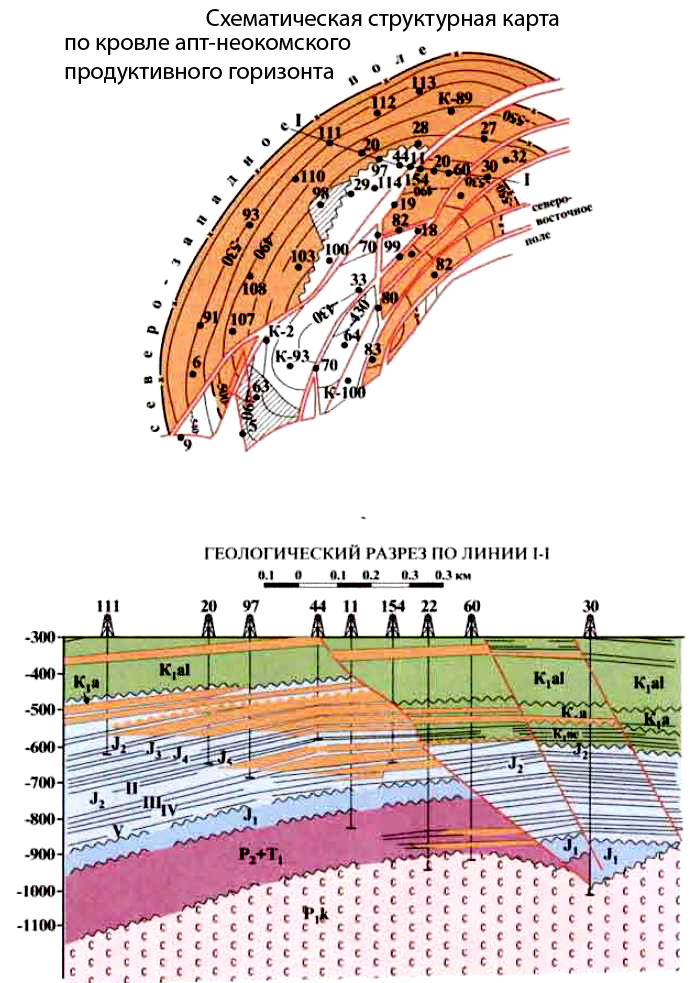 В структурном отношении месторождение приурочено к трехкрылому куполу северо-восточного простирания. На северо-западном крыле разведаны