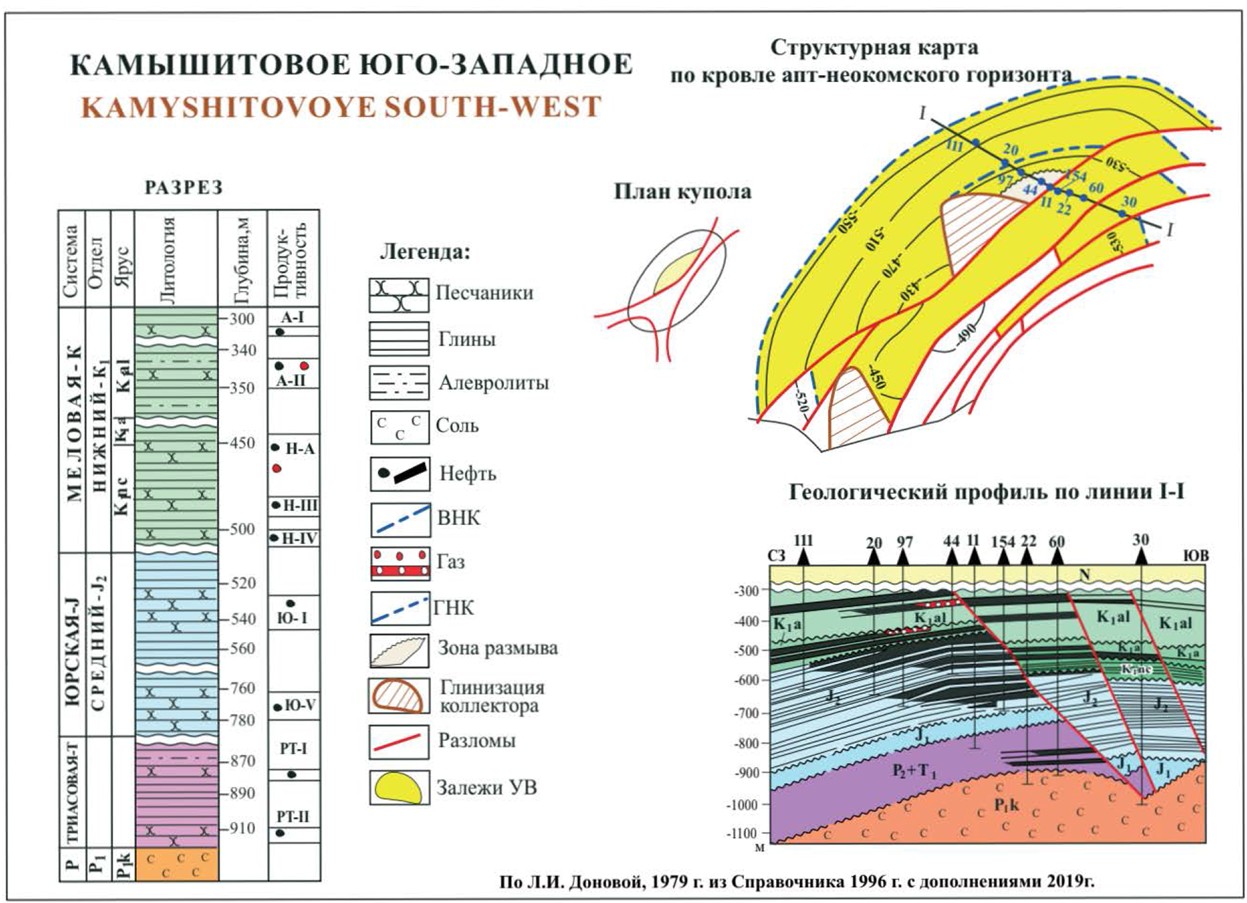 Рис.1. Газонефтяное месторождение Юго-Западное Камышитовое (по материалам Л.И. Доновой, 1976 г.)
