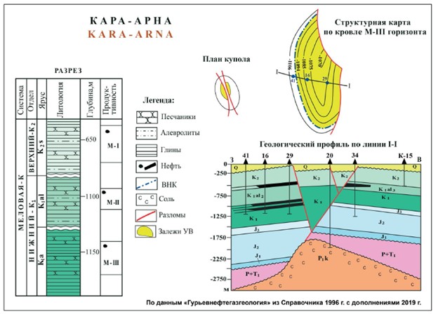 Нефтяное месторождение Кара-Арна располагается на юге Южно-Эмбинской нефтегазоносной области, рядом с месторождением Тенгиз. В структурном отношении месторождение контролируется одноименным двухкрылым соляным куполом субмеридиональной ориентировки. На обоих крыльях обнаружены залежи нефти, экранированные сбросами грабена. В отложениях нижнего и верхнего мела разведаны три нефтяные горизонты.