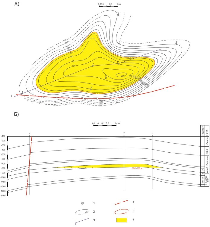 Рис.1. Подсчетный план горизонта XII (А) и строение продуктивной части разреза по линии профиля I-I (Б) месторождения Карабаир [Солопов и др., 2011] 1 - поисково-разведочные скважины, 2 - изогипсы по кровле XII горизонта, 3 - линия геологического профиля, 4 - разрывные нарушения, 5 - газоводяной контакт, 6 - предполагаемая залежь (ПХГ).