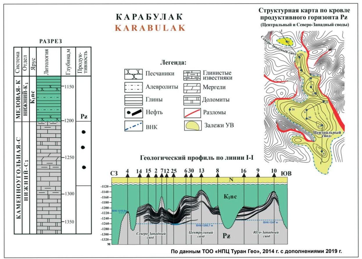Нефтяное месторождение Карабулак расположено на северо-западном участке Аксайской горст-антиклинали и расположено в 110 км к северу от г. Кызылорда. Промышленная нефтеносность установлена на четырех самостоятельных небольших по размеру сводах: Северо-Западном и Северном (в районе скважин КБ-4 и КБ-18), на Центральном и Юго-Западном. Залежи единственного горизонта PZ приурочены к трещиновато-кавернозным отложениям нижнекаменноугольной системы, имеющим свои водонефтяные контакты. На Юго-Западном своде ВНК установлен на отметке минус 1247м, на Север-оЗападном и Северном сводах ВНК - на отметках минус 1219,9 м и -1225,1 м соответственно. Центральный свод содержит основные запасы нефти и газа (70 % от общих запасов), ВНК на отметке минус 1260,7м. Размеры Центрального свода, имеющего изометричную форму, составляют 4х5 км.