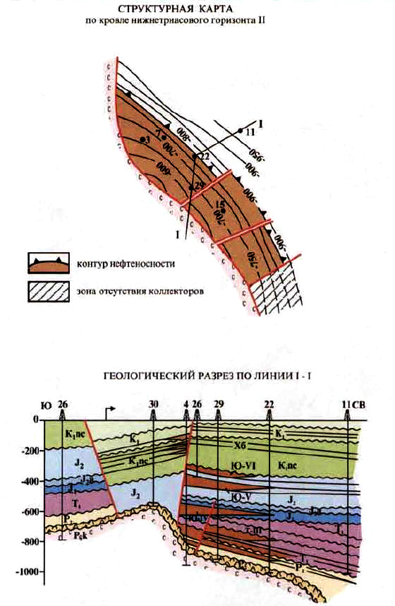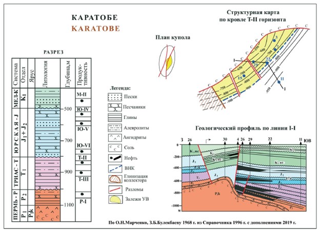 Рис.1. Нефтяное месторождение Каратобе (по О.Н. Марченко, З.Е. Булекбаеву и др., 1968, А.А. Абаханову и др., 1990).