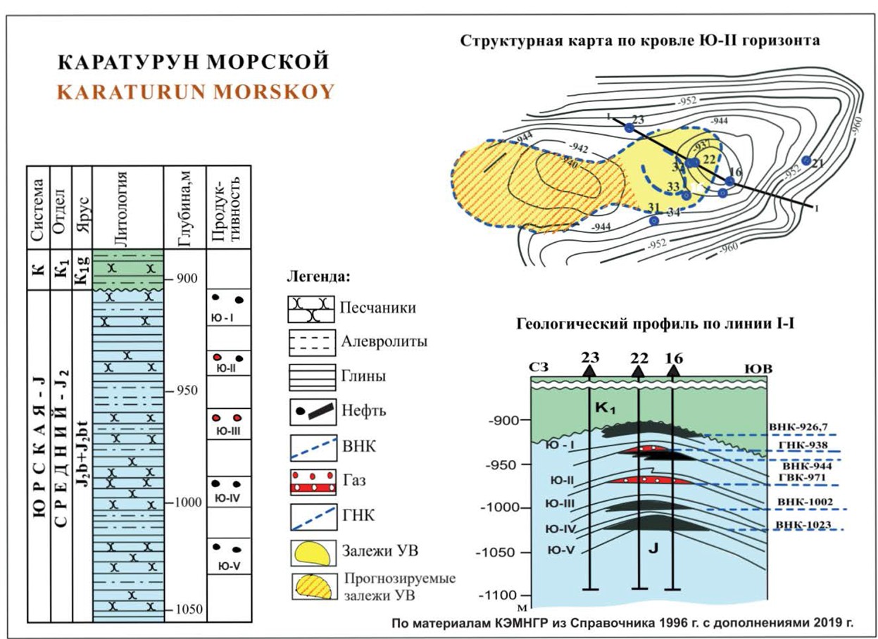 Газонефтяное месторождение Каратурун Морской расположено на северно1't побережье полуострова Бозашы, занимает самое северное место в Каратурунской группе месторождений. В структурном отношении месторождение контролируется малоаплитудным (до 25 м) н не осложненным разломами поднятием субширотного простирания. Западная периклиналь омывается водами Каспийского моря. В контурах поднятия выделяются западная и восточная вершины. На восточной вершине установлена нефтегазоносность юрских отложений.