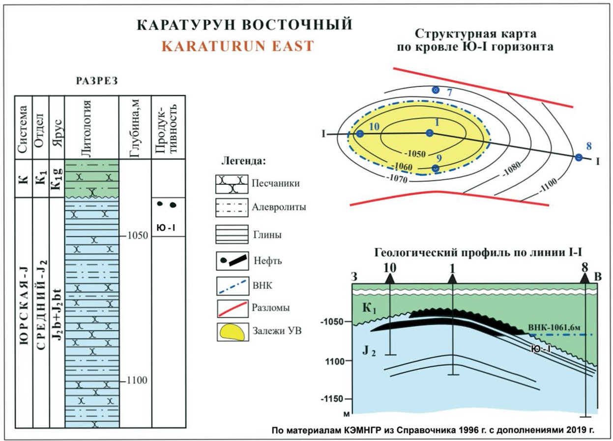Нефтяное месторождение Каратурун Восточный расположено на северо -востоке Бозашынскоrо полуострова. В структурном отношении месторождение контролируется горстоподобным поднятием в мезозойских отложениях, ограниченным на севере и юге разломами. В сводовой части поднятия сейсморазведкой выявлена небольшая вершина субширотного простирания. Амплитуда ловушки составляет 45 м. Продуктивность связана с юрскими отложениями.